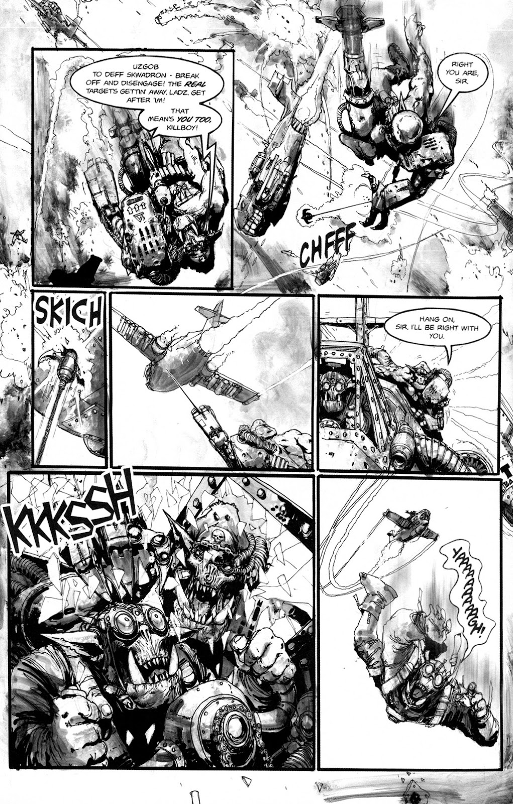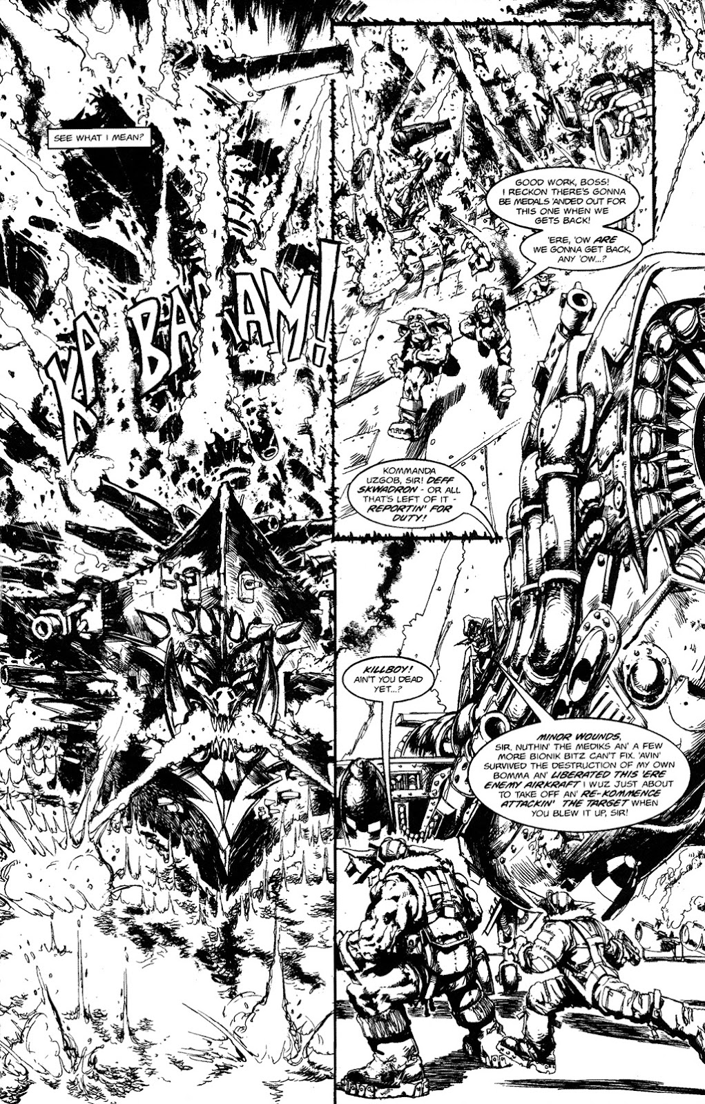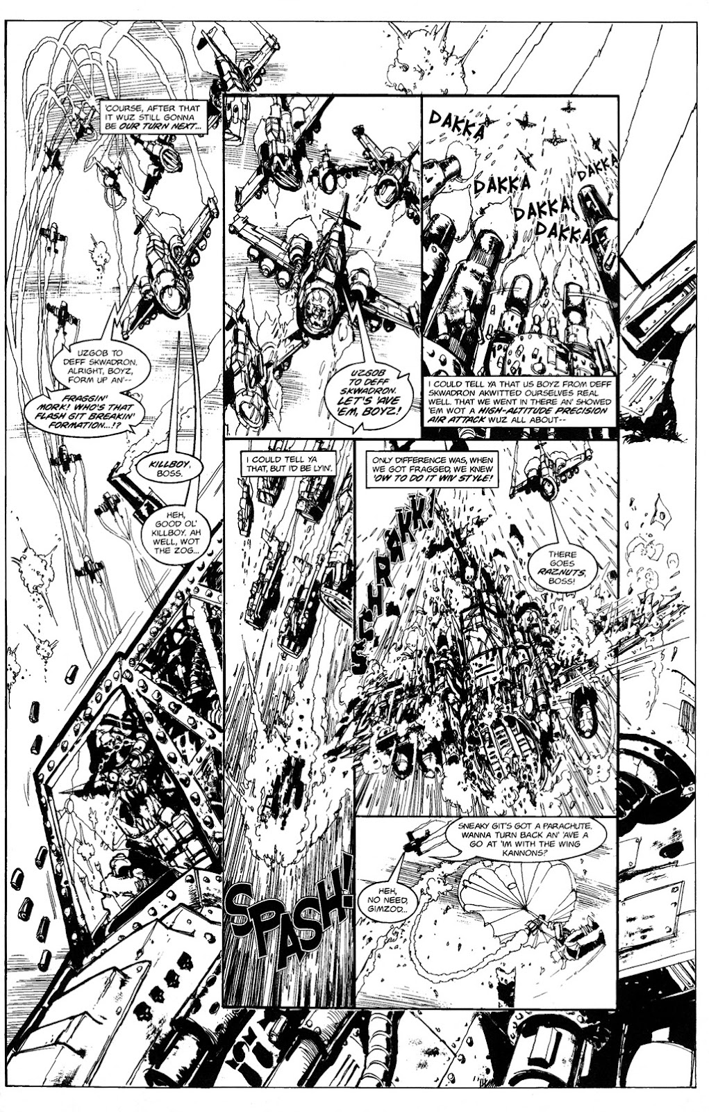 Uzgob, an Ork pilot, drags himself and his smartboy out of the sinking wreckage of his plane, then digs his fingers into the metal hull of an ork battleship and clambers onto the deck while carrying him. 1, 2DS