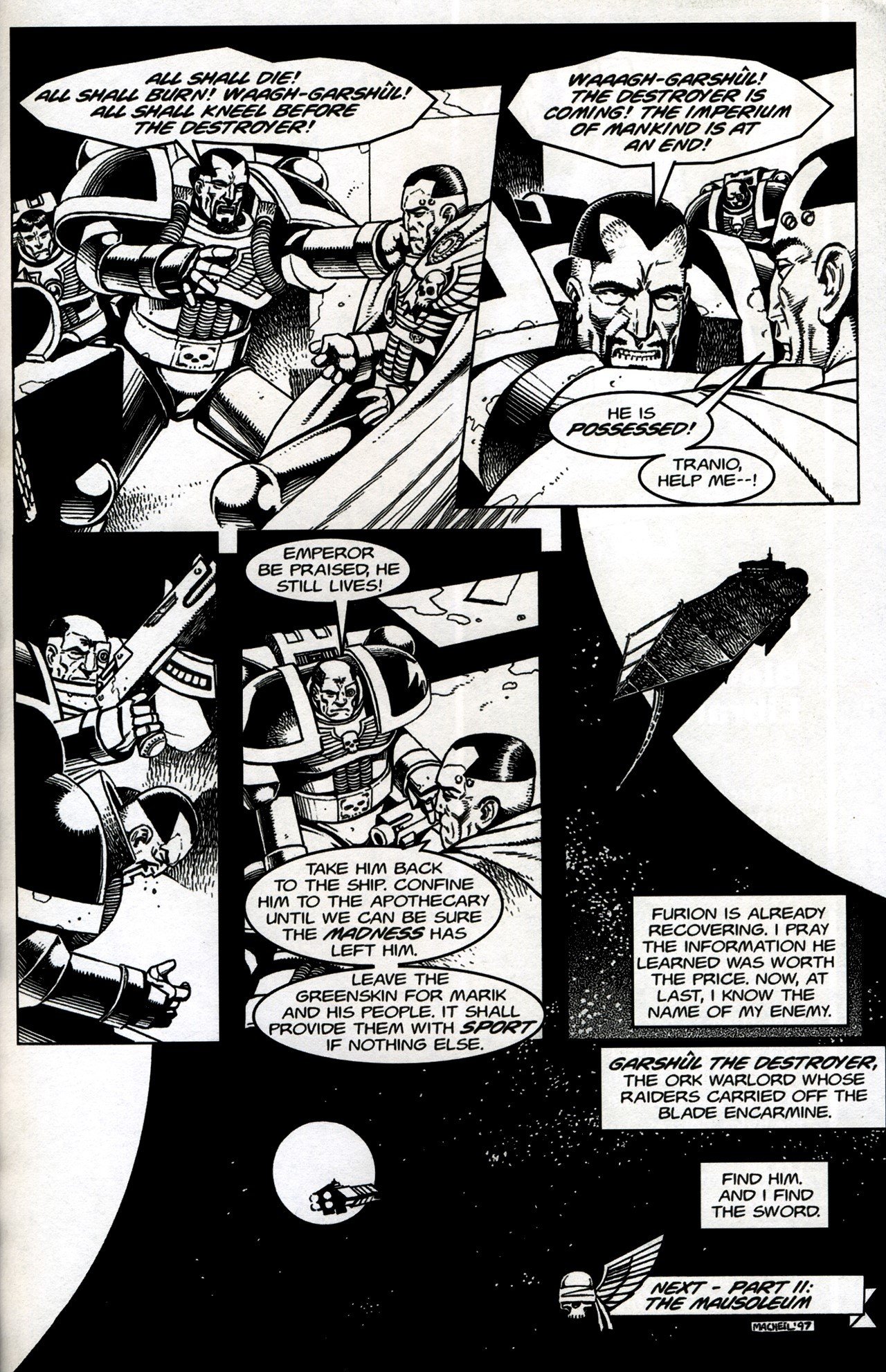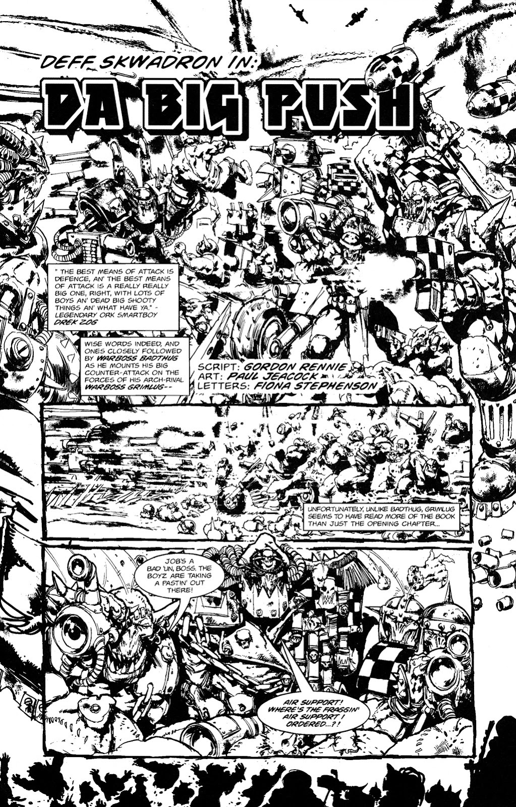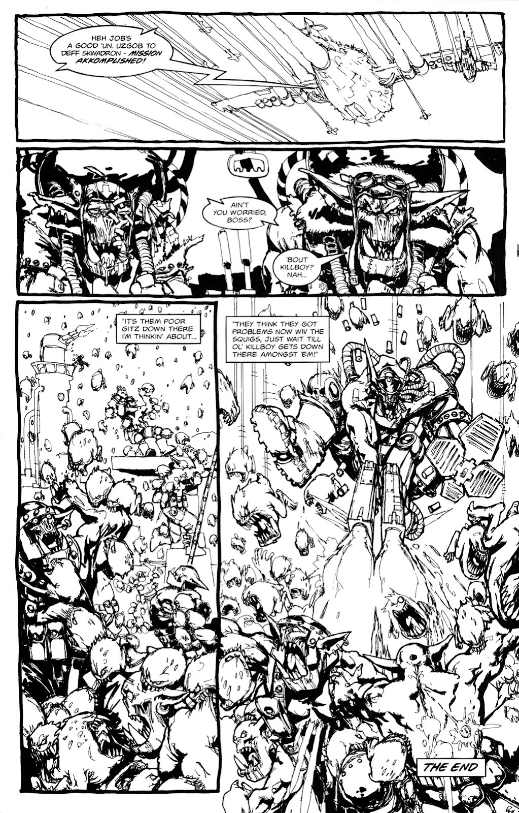 Uzgob, an Ork pilot, drags himself and his smartboy out of the sinking wreckage of his plane, then digs his fingers into the metal hull of an ork battleship and clambers onto the deck while carrying him. 1, 2DS