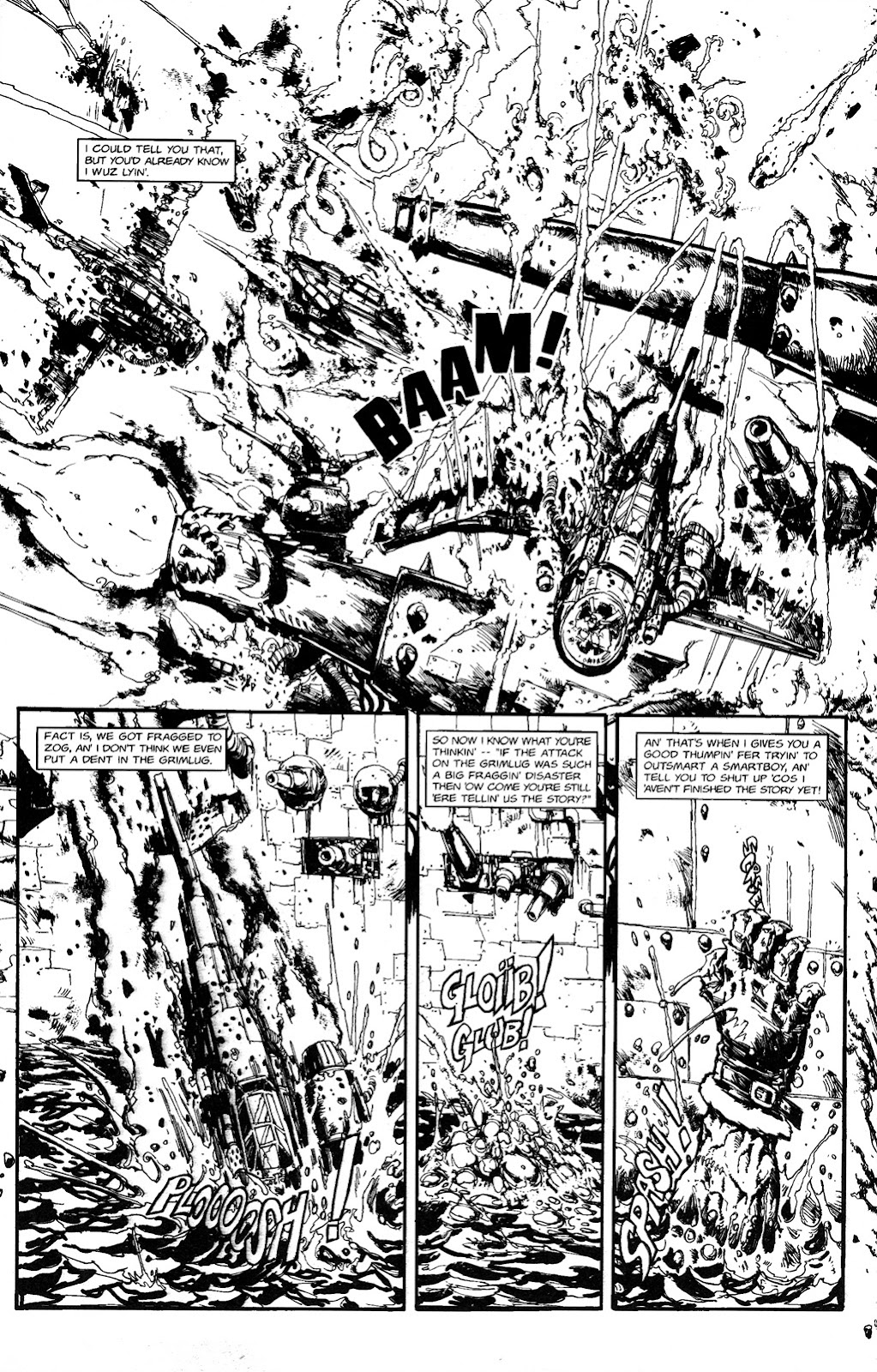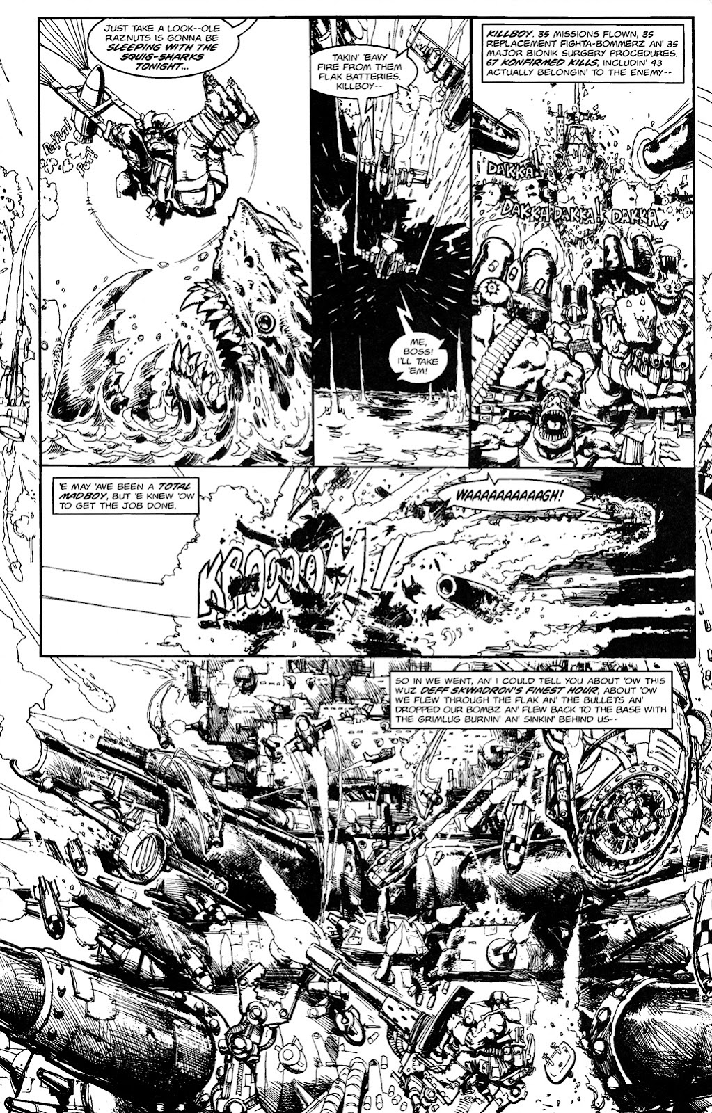 Killboy gets dropped out of a plane’s bomb doors mid-flight, and survives both the fall and being chewed on by rabid squigs. 1, 2