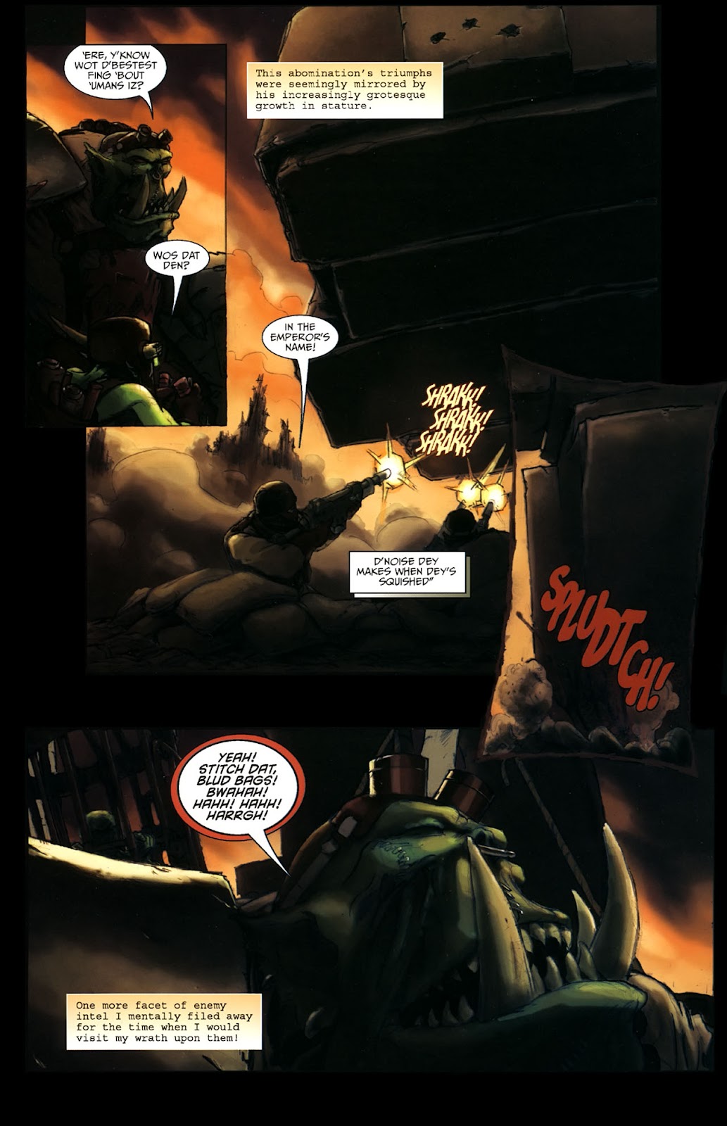 An armoured Ork gets shot in the chest six times and shrugs it offDC