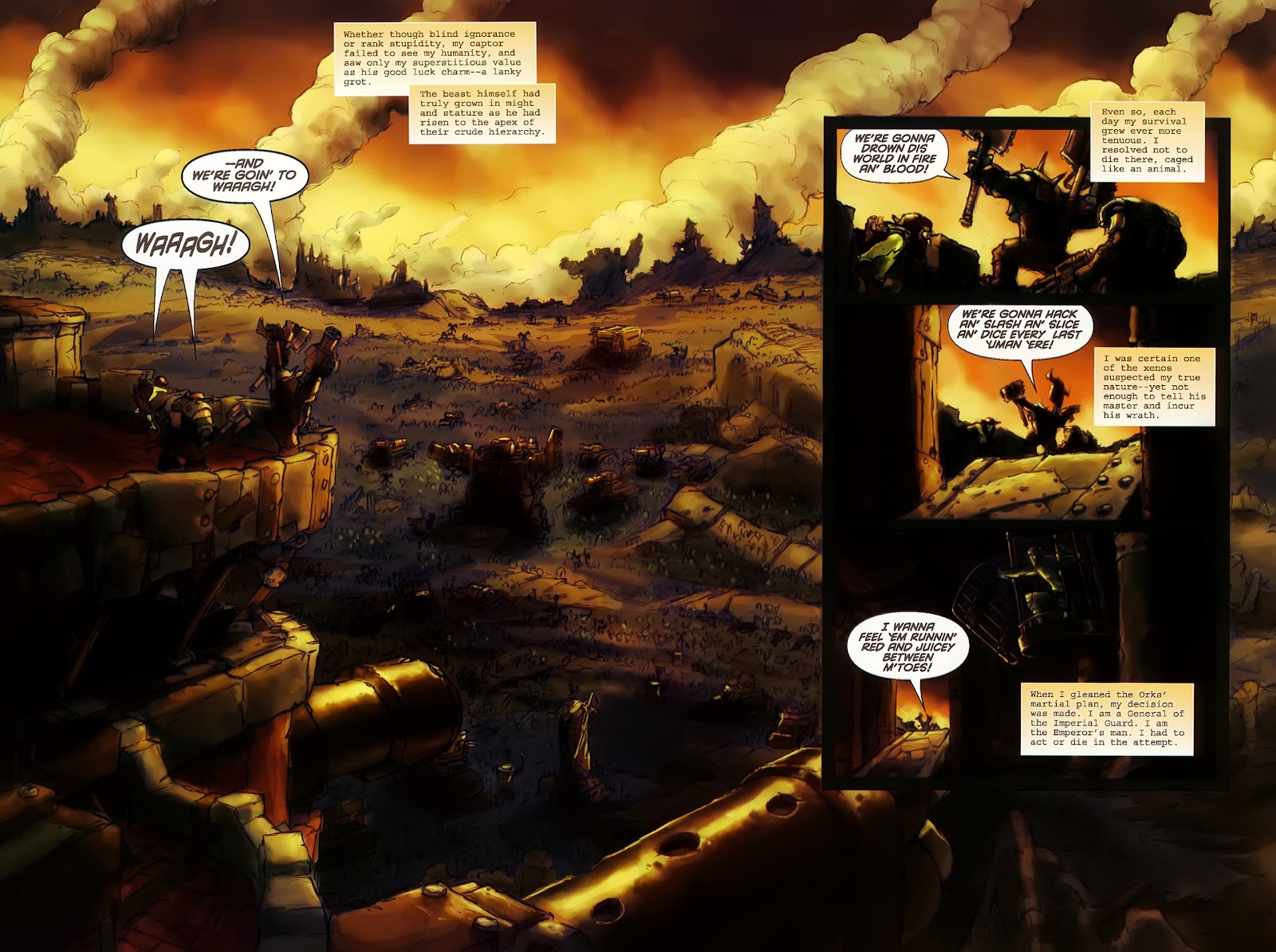 The WAAAAAAAGH!!: Greenskins have an innate psychic connection to the Warp,EWG and although most of them can’t make use of it at will, it manifests in a number of unconscious ways to make reality “correct” itself to match what Orks expect of it. The more Orks gathered in one place, the stronger Waaaaagh energy becomes. HereXE is a detailed review of the Waaagh phenomenon as recorded by a Magos Biologis researcher.
