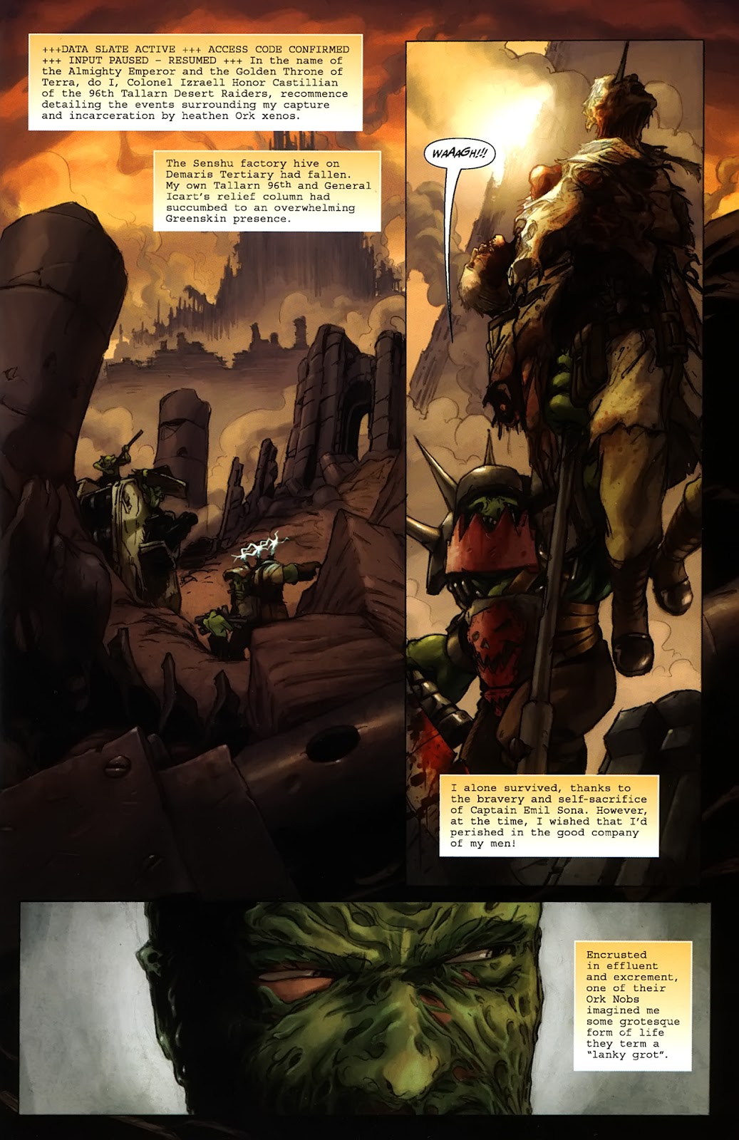 Orks’ bodies feature numerous redundant organsXE and they can survive even with most of their body masses missing. For example, Orks are able to survive for an extended period of time as a severed head, and will make a full recovery so long as they’re sewn back onto a body.EWG Here’s a page from a comic showing off a headless Ork’s resilience.BQ It’s even implied that an Ork is able to function to some degree without a brain.EWG